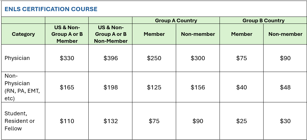 Fees for each ENLS® Course are calculated based on the number of participants, profession and geographic location. The host is responsible for setting a price, collecting participants' registration fees and distributing course material.