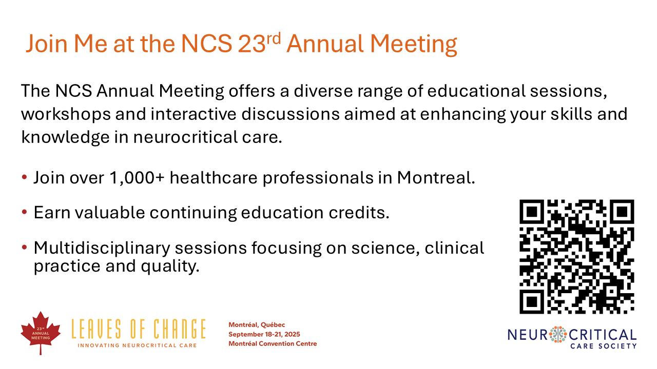 - Join me, along with hundreds of neurocritical care professionals in Montréal, Québec, Sept. 18-21, at the NCS 23rd Annual meeting and network with your neurocritical peers. neurocriticalcare.org/annualmeeting #NCS2025 @neurocritical