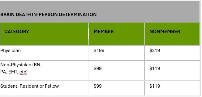 This live course is accredited for 5 hours of continuing education. It includes didactic instruction, simulation and mannequin opportunities, case vignettes and mock family discussions along with a 25-question exam at completion of the event. Once the class has been attended and the exam passed with a score of 100% (unlimited retakes allowed), participants will be granted a certificate of completion. Certificates of completion are valid for two years, during which an individual retains access to their Brain Death Determination account and course materials.